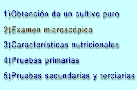 Examen microscópico de células vivas y de frotis teñido por coloración Gram. Se determina así la forma y el Gram del microorganismo en estudio. También es importante determinar la agrupación y la presencia de esporas y otras características morfológicas de interés.