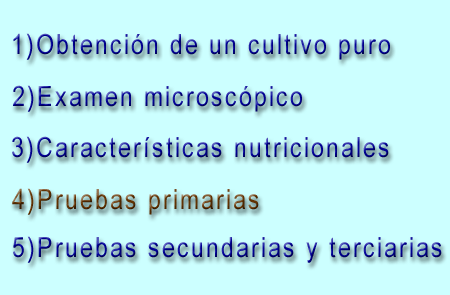 Se utilizan un grupo de pruebas, denominadas pruebas primarias, con las cuales se puede determinar el género, grupo de géneros o en algún caso familia a la que pertenece un aislamiento. Las pruebas primarias suelen ser: Gram, morfología, catalasa, oxidasa, Oxidación-Fermentación, fermentación de glucosa, esporas, movilidad, crecimiento en aerobiosis y anaerobiosis.