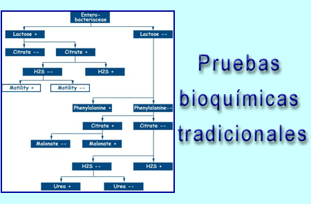 Los ensayos bioquímicos tradicionalmente utilizados, llamadas pruebas bioquímicas convencionales, generalmente determinan la actividad de una vía metabólica (conjunto de reacciones químicas) a partir de un sustrato que se incorpora en un medio de cultivo y que la bacteria al crecer transforma o no.